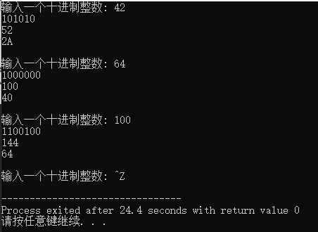 #include <stdio.h> #define N 100 void dec2n(int x, int n); char hhh(int y); int main() { int x; printf("输入一个十进制整数: "); while(scanf("%d", &x) != EOF) { dec2n(x, 2); // 函数调用: 把x转换成二进制输出 dec2n(x, 8); // 函数调用: 把x转换成八进制输出 dec2n(x, 16); // 函数调用: 把x转换成十六进制输出 printf("\n输入一个十进制整数: "); } return 0; } void dec2n(int x, int n){ int i=0,j=0; int a[N]={0}; while(x){ a[i]=x%n; x/=n; i++; } for(j=i-1;j>=0;j--){ if(a[j]<0){ return; } else if(a[j]>=0&&a[j]<10) { printf("%d",a[j]); } else { printf("%c",hhh(a[j])); } } printf("\n"); } char hhh(int y){ int i=0; i=y-10; return 'A'+i; }