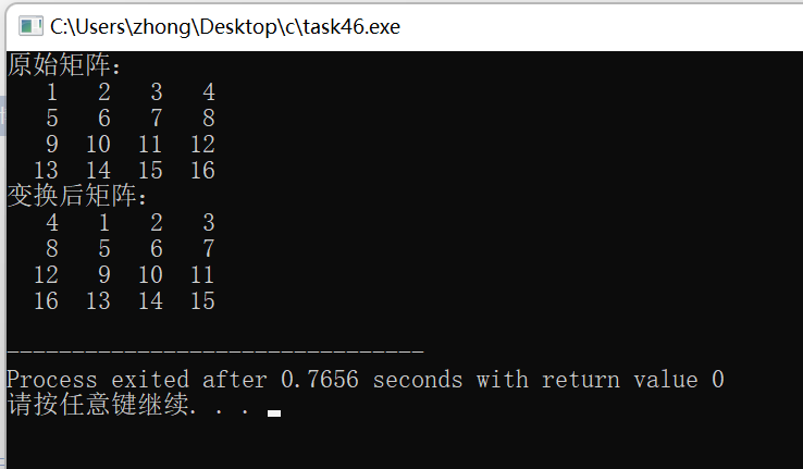 #include<stdio.h> #define N 100 #define M 4 void output(int x[][N],int n); void rotate_to_right(int x[][N],int n); int main() { int t[][N]={{1,2,3,4}, {5,6,7,8}, {9,10,11,12}, {13,14,15,16}}; printf("原始矩阵:\n"); output(t,M); rotate_to_right(t,M); printf("变换后矩阵:\n"); output(t,M); return 0; } void output(int x[][N],int n) { int i,j; for(i=0;i<n;++i) { for(j=0;j<n;++j) printf("%4d",x[i][j]); printf("\n"); } } void rotate_to_right(int x[][N],int n) { int i,j,y[n]; for(i=0;i<n;++i) y[i]=x[i][n-1]; for(i=0;i<n;++i) { for(j=n-1;j>=1;--j) x[i][j]=x[i][j-1]; x[i][0]=y[i]; } }