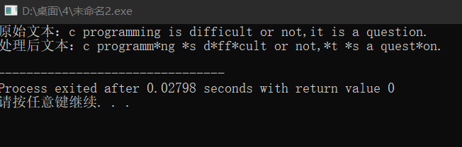 #include <stdio.h> #define N 80 void replace(char x[],char old_char,char new_char); int main(){ char text[N]="c programming is difficult or not,it is a question."; printf("原始文本:"); printf("%s\n",text); replace(text,'i','*'); printf("处理后文本:"); printf("%s\n",text); return 0; } void replace(char x[],char old_char,char new_char){ int i; for(i=0;x[i]!='\0';i++) if(x[i]==old_char) x[i]=new_char; }