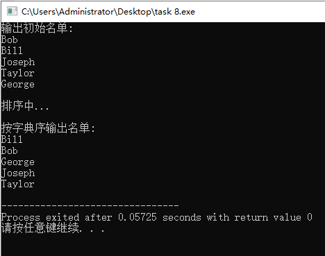 #define N 5 #define M 20 void bubble_sort(char str[][M], int n); int main() { char name[][M] = {"Bob", "Bill", "Joseph", "Taylor", "George"}; int i; printf("输出初始名单:\n"); for (i = 0; i < N; i++) printf("%s\n", name[i]); printf("\n排序中...\n"); bubble_sort(name, N); printf("\n按字典序输出名单:\n"); for (i = 0; i < N; i++) printf("%s\n", name[i]); return 0; }