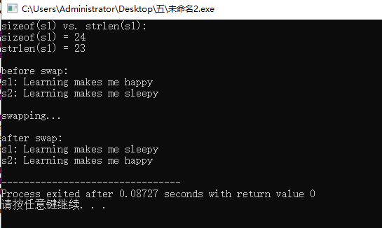 #include <stdio.h> #include <string.h> #define N 80 int main() { char *s1 = "Learning makes me happy"; char *s2 = "Learning makes me sleepy"; char *tmp; printf("sizeof(s1) vs. strlen(s1): \n"); printf("sizeof(s1) = %d\n", sizeof(s1)); printf("strlen(s1) = %d\n", strlen(s1)); printf("\nbefore swap: \n"); printf("s1: %s\n", s1); printf("s2: %s\n", s2); printf("\nswapping...\n"); tmp = s1; s1 = s2; s2 = tmp; printf("\nafter swap: \n"); printf("s1: %s\n", s1); printf("s2: %s\n", s2); return 0; }