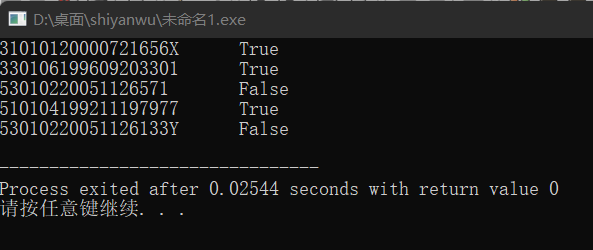#include <stdio.h> #include <string.h> #define N 5 int check_id(char* str); // 函数声明 int main() { char* pid[N] = { "31010120000721656X", "330106199609203301", "53010220051126571", "510104199211197977", "53010220051126133Y" }; int i; for (i = 0; i < N; ++i) if (check_id(pid[i])) // 函数调用 printf("%s\tTrue\n", pid[i]); else printf("%s\tFalse\n", pid[i]); return 0; } // 函数定义 // 功能: 检查指针str指向的身份证号码串形式上是否合法。 // 形式合法,返回1,否则,返回0 int check_id(char* str) { int i, j, k; char* tmp; tmp=str; while ((*tmp <='9' && *tmp >= '0') || *tmp == 'X') tmp++; if (*tmp == '\0' && strlen(str) == 18) return 1; else return 0; }