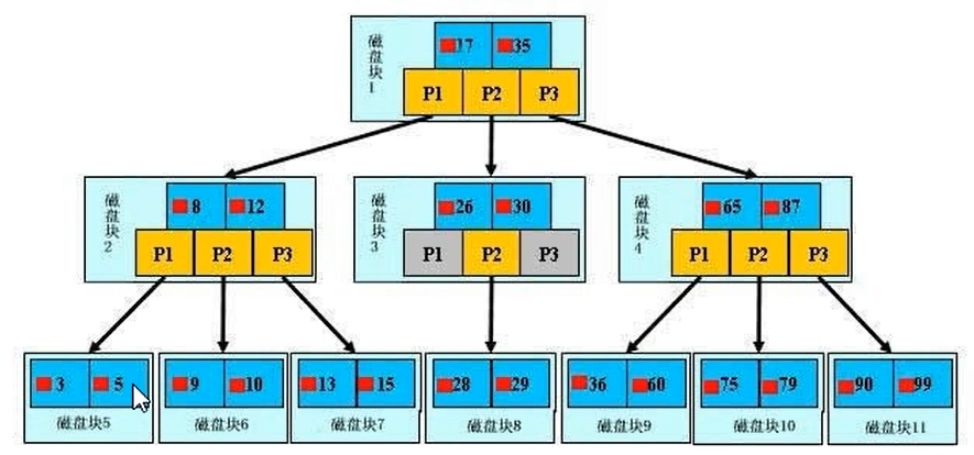 B+树中每一个磁盘块,有两个数据项,一块三个地址,在查询时,会比较大小
