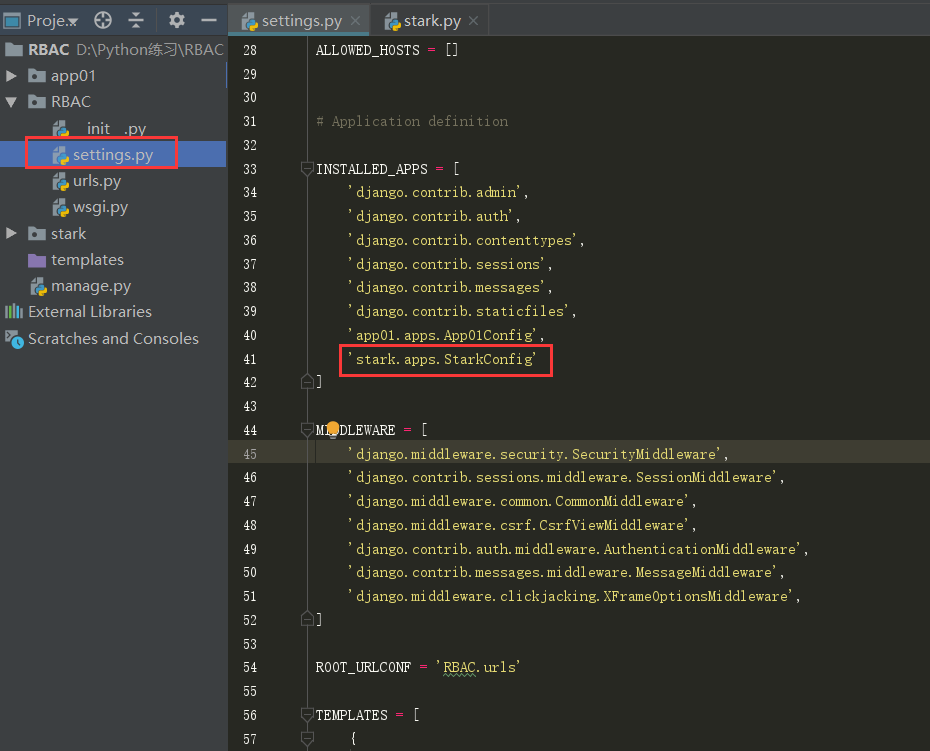 在settings下找到 INSTALLED_APPS并在下面配置 'stark.apps.StarkConfig' (注:双引号不能省略)