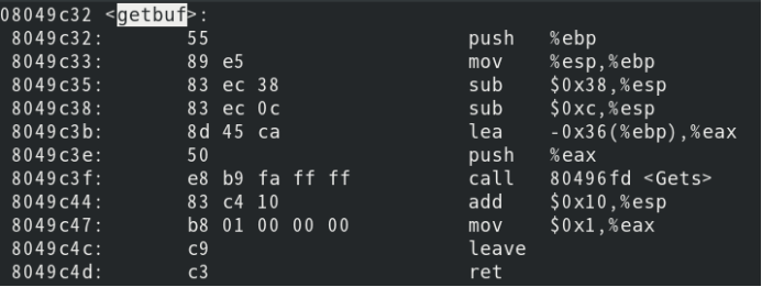观以及getbuf()正确的返回地址为0x8049c32,于是可以构造如下代码: