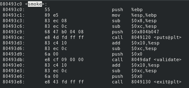 从代码可知,smoke()函数的首地址为0x80493c0,小端方式存储为c0 93 04 08。