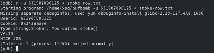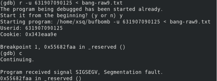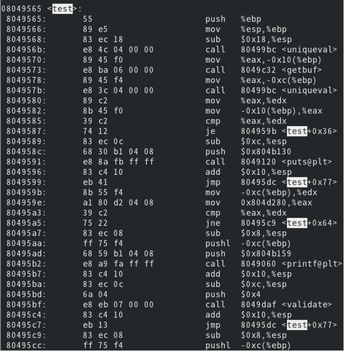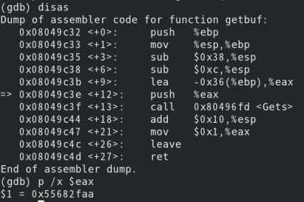 首先我们要知道要恢复哪个寄存器,每一级我们都要从-0x36(%ebp)这个位置一路覆盖到返回地址+0x4(%ebp),显然(%ebp)这个位置也被我们的字符串覆盖了。我们知道,%ebp是called栈的基址,也就是当前函数的帧指针;(%ebp)是这个基址位置里的内容,也是一个指针,指向caller栈的基址,即调用者的帧指针,在这里是test()的帧指针。当getbuf()返回时试图把(%ebp)恢复到%ebp,但(%ebp)里是我们输入的字符串,我们需要把test()的%ebp里的值找出来,再利用我们写入的指令把它重新赋给%ebp. 要找到原%ebp的值,这需要使用gdb,在test()的代码处设置断点。