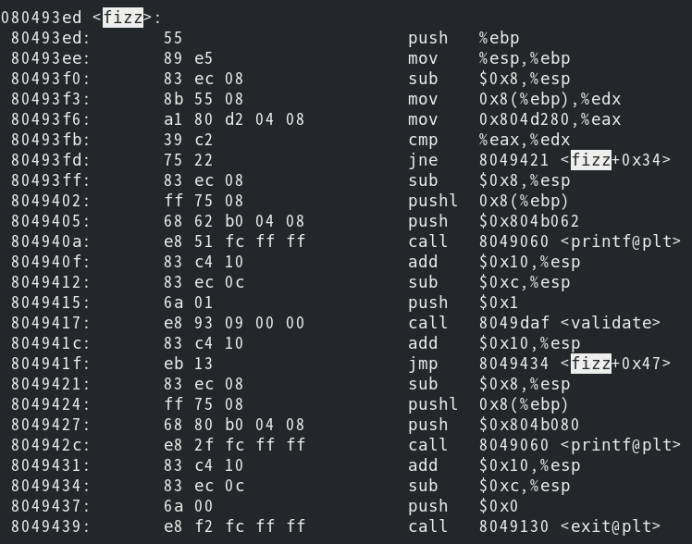 又因为如果直接跳到fizz()函数的首地址会覆盖掉我们已经修改的ebp的值,所以我们需要跳到80493f3=0000 1000 0000 0100 1001 0011 1111 0011=30 3f 49 80,所以用f3 93 04 08覆盖返回地址的值。