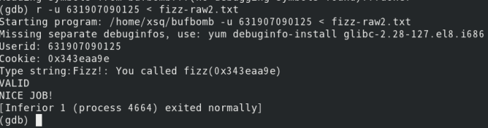 从代码可以看出调用fizz()函数第一个分支的条件是0x804d280和0x8(%ebp)的内容相等。0x804d280的值为内置的cooki值,0x8(%ebp)的值为我们需要利用缓冲区溢出构造的值。