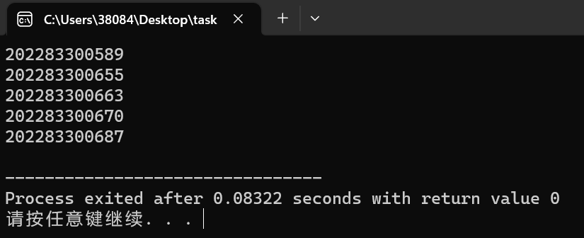 #include <stdio.h> #include <stdlib.h> #include <time.h> #define N 5 #define R1 586 #define R2 701 int main() { int number; int i; srand( time(0) ); for(i = 0; i < N; ++i) { number = rand() % (R2 - R1 + 1) + R1; printf("20228330%04d\n", number); } return 0; }
