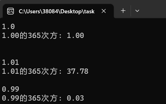 #include <stdio.h> #include <math.h> int main() { double x, ans; while(scanf("%lf", &x) != EOF) { ans = pow(x, 365); printf("%.2f的365次方: %.2f\n", x, ans); printf("\n"); } return 0; }