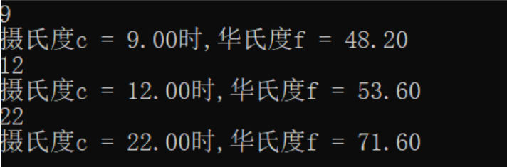 #include<stdlib.h> int main () { double x,f; while(scanf("%lf",&x)!=EOF) { scanf("%lf",&x); f=9*x/5+32; printf("摄氏度c=%.2f时,华氏度f=%.2f\n",x,f); } system("pause"); return 0; }