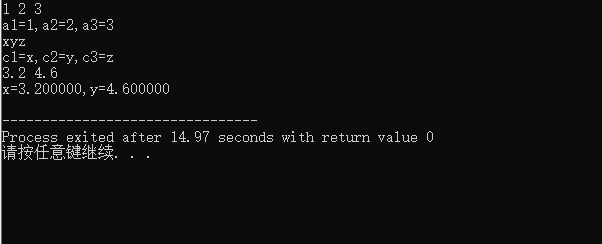 #include<stdio.h> int main(){ double x,y; char c1,c2,c3; int a1,a2,a3; scanf("%d%d%d",&a1,&a2,&a3);//有误 printf("a1=%d,a2=%d,a3=%d\n",a1,a2,a3); scanf("%c%c%c",&c1,&c2,&c3); printf("c1=%c,c2=%c,c3=%c\n",c1,c2,c3) ; scanf("%lf%lf",&x,&y);//有误 printf("x=%lf,y=%lf\n",x,y); return 0; }