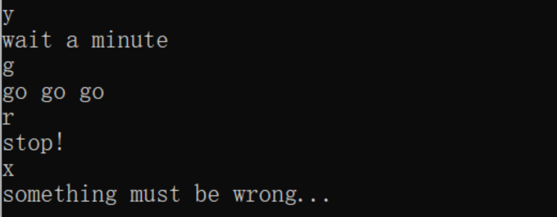 #include<stdio.h> int main() { char light; while(scanf("%c",&light)!=EOF){ getchar(); switch(light){ case'r':printf("stop!\n");break; case'g':printf("go go go\n");break; case'y':printf("wait a minute\n");break; default:printf("something must be wrong...\n");break; } } return 0; }