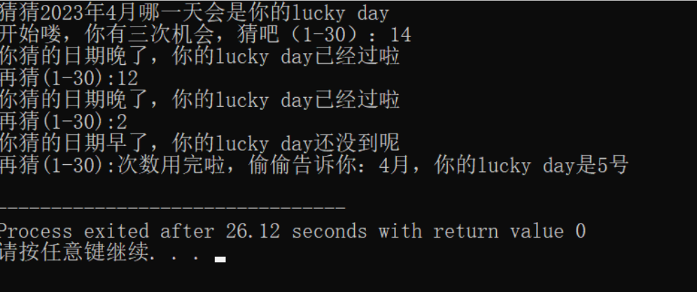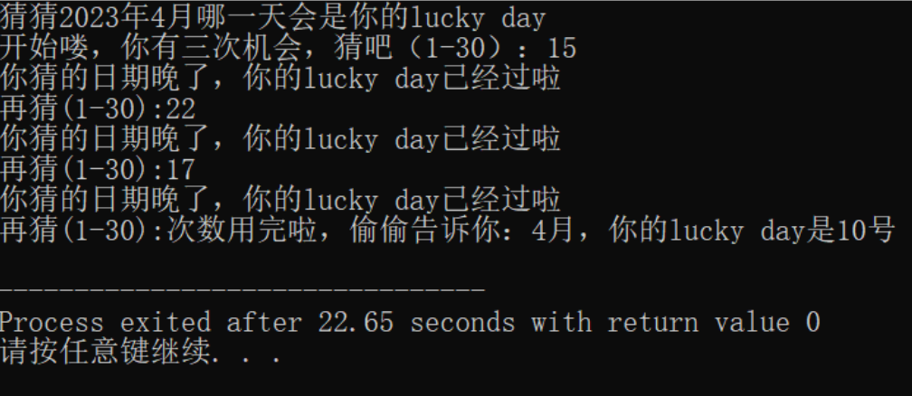 #include<stdio.h> #include<stdlib.h> #include<time.h> #define N 3 #define R1 1 #define R2 30 int main() { int n1,n2,i,flag; srand(time(0)); flag=0; n1 = rand()%(R2-R1+1)+R1; printf("猜猜2023年4月哪一天会是你的lucky day\n"); printf("开始喽,你有三次机会,猜吧(1-30):"); for(i=1;i<=N;i++) { scanf("%d",&n2); if(n2==n1){ printf("哇,猜中了:-\n"); break; } else if(n2>n1) printf("你猜的日期晚了,你的lucky day已经过啦\n"); else printf("你猜的日期早了,你的lucky day还没到呢\n"); printf("再猜(1-30):"); flag++; } if(flag==3) printf("次数用完啦,偷偷告诉你:4月,你的lucky day是%d号\n",n1); return 0; }