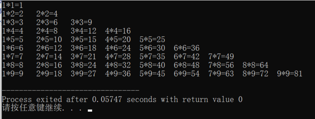 #include<stdio.h> int main() { int line,column; for(line=1;line<=9;line++){ for(column=1;column<=line;column++){ printf("%d*%d=%d\t",column,line,line*column); } printf("\n"); } return 0; }
