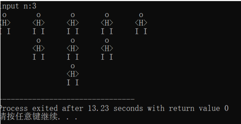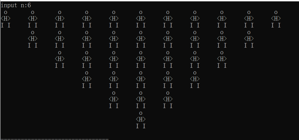 #include<stdio.h> int main() { int n,i,j; printf("input n:"); scanf("%d",&n); for(i=1;i<=n;i++){ for(j=1;j<i;j++) printf("\t"); for(j=1;j<=2*(n-i)+1;j++) printf(" o \t"); printf("\n"); for(j=1;j<i;j++) printf("\t"); for(j=1;j<=2*(n-i)+1;j++) printf("<H>\t"); printf("\n"); for(j=1;j<i;j++) printf("\t"); for(j=1;j<=2*(n-i)+1;j++) printf("I I\t"); printf("\n"); } return 0; }