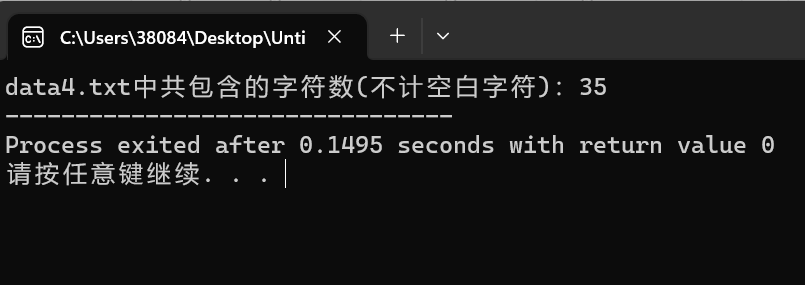 #include <stdio.h> #include <stdlib.h> #include <string.h> const int N = 5, M = 100; int main() { char ch[M]; int n = 0; FILE *fp; fp = fopen("C:/Users/38084/Desktop/data4.txt.txt","r"); while(! feof(fp)) { fscanf(fp,"%s",ch); n += strlen(ch); } printf("data4.txt中共包含的字符数(不计空白字符):%d",n); fclose(fp); return 0; }