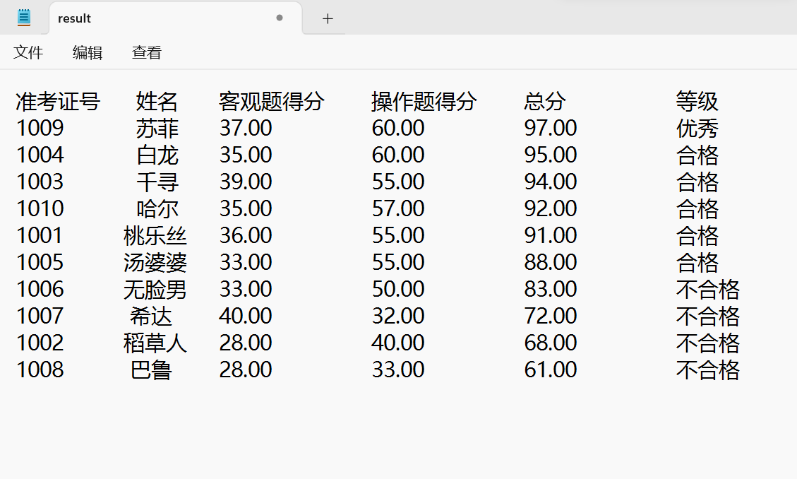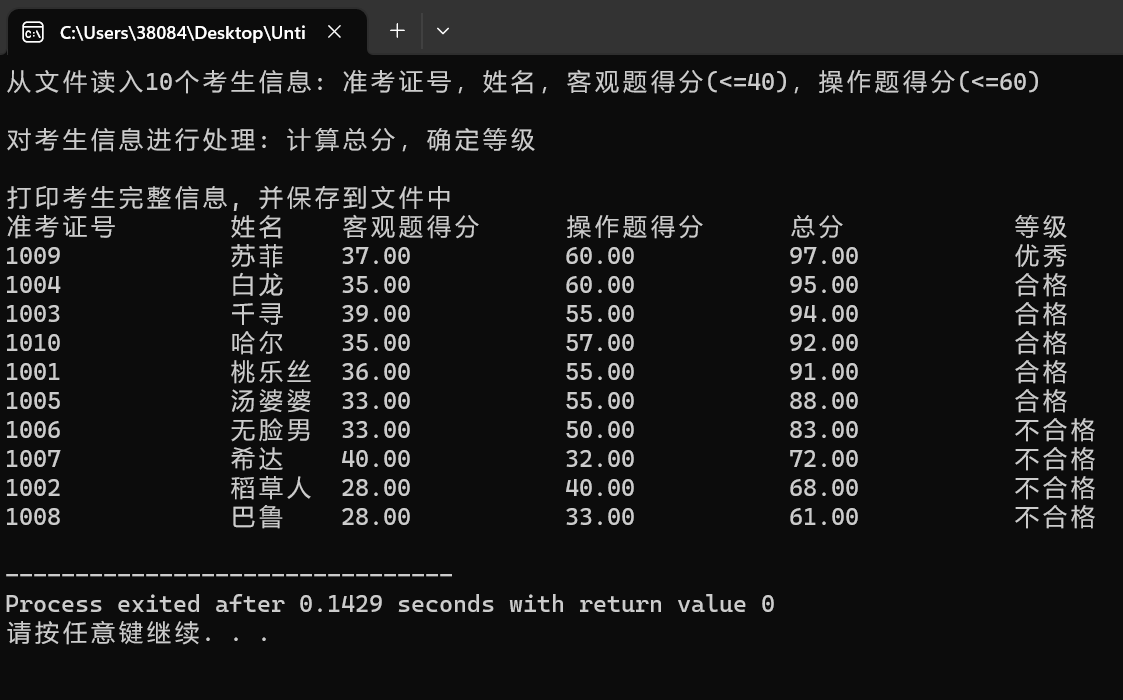 #include <stdio.h> #include <string.h> #include <stdlib.h> #define N 10 typedef struct { long int id; char name[20]; float objective; // 客观题得分 float subjective; // 操作题得分 float sum; char level[10]; } STU; // 函数声明 void input(STU s[], int n); void output(STU s[], int n); void process(STU s[], int n); int main() { STU stu[N]; printf("从文件读入%d个考生信息: 准考证号,姓名,客观题得分(<=40),操作题得分(<=60)\n", N); input(stu, N); printf("\n对考生信息进行处理: 计算总分,确定等级\n"); process(stu, N); printf("\n打印考生完整信息, 并保存到文件中"); output(stu, N); return 0; } // 从文本文件examinee.txt读入考生信息:准考证号,姓名,客观题得分,操作题得分 void input(STU s[], int n) { int i; FILE* fin; fin = fopen("C:/Users/38084/Desktop/exam.txt", "r"); if (fin == NULL) { printf("fail to open file\n"); exit(0); } while (!feof(fin)) { for (i = 0; i < n; i++) fscanf(fin, "%ld %s %f %f", &s[i].id, s[i].name, &s[i].objective, &s[i].subjective); } fclose(fin); } // 输出考生完整信息: 准考证号,姓名,客观题得分,操作题得分,总分,等级 // 不仅输出到屏幕上,还写到文本文件result.txt中 void output(STU s[], int n) { FILE* fout; int i; // 输出到屏幕 printf("\n"); printf("准考证号\t姓名\t客观题得分\t操作题得分\t总分\t\t等级\n"); for (i = 0; i < n; i++) printf("%ld\t\t%s\t%.2f\t\t%.2f\t\t%.2f\t\t%s\n", s[i].id, s[i].name, s[i].objective, s[i].subjective, s[i].sum, s[i].level); // 保存到文件 fout = fopen("result.txt", "w"); if (!fout) { printf("fail to open or create result.txt\n"); exit(0); } fprintf(fout, "准考证号\t\t姓名\t客观题得分\t操作题得分\t总分\t\t等级\n"); for (i = 0; i < n; i++) fprintf(fout, "%ld\t\t%s\t%.2f\t\t%.2f\t\t%.2f\t\t%s\n", s[i].id, s[i].name, s[i].objective, s[i].subjective, s[i].sum, s[i].level); fclose(fout); } // 对考生信息进行处理:计算总分,排序,确定等级 void process(STU s[], int n) { STU tmp; int i, j; for (i = 0; i < n; ++i) { s[i].sum =s[i].objective+s[i].subjective; } for (i = 0; i < n-1; ++i) { for (j = 0; j < n- i-1; ++j) { if (s[j].sum < s[j + 1].sum) { tmp = s[j]; s[j] = s[j + 1]; s[j + 1] = tmp; } } } for (i = 0; i < n; ++i) { if (i < n * 0.1) strcpy(s[i].level, "优秀"); else if (i >= n * 0.1 && i <= n * 0.5) strcpy(s[i].level, "合格"); else strcpy(s[i].level, "不合格"); } }