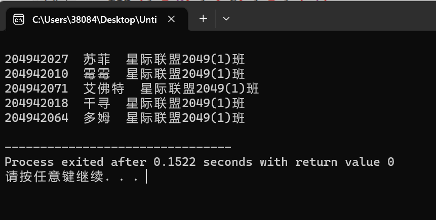 #include <stdio.h> #include <stdlib.h> #include <time.h> #define N 80 typedef struct { long int id; char name[20]; char _class[100]; }STU; void input(STU s[], int n); void output(STU a[], int n); void process(STU s[], STU a[], int n); int main() { STU stu[N], a[5]; input(stu, N); process(stu, a, N); output(a, 5); return 0; } void input(STU s[],int n) { int i; FILE* fin; fin = fopen("C:/Users/38084/Desktop/list.txt", "r"); if(fin==NULL) { printf("fail to open file\n"); exit(0); } while(!feof(fin)) { for (i = 0; i < n; i = i + 1) fscanf(fin, "%ld %s %s", &s[i].id, &s[i].name, &s[i]._class); } fclose(fin); } void output(STU a[],int n) { FILE* fout; int i; printf("\n"); for (i = 0; i < n; i = i + 1) printf("%ld %s %s\n", a[i].id, a[i].name, a[i]._class); fout = fopen("lucky.txt", "w"); if(!fout) { printf("fail to open or create lucky.txt\n"); exit(0); } for (i = 0; i < n; i = i + 1) fprintf(fout, "%ld %s %s\n", a[i].id, a[i].name, a[i]._class); fclose(fout); } void process(STU s[],STU a[], int n) { int b1, b2, b3, b4, b5; srand(time(0)); b1 = rand() % 80 + 1; b2 = rand() % 80 + 1; b3 = rand() % 80 + 1; b4 = rand() % 80 + 1; b5 = rand() % 80 + 1; a[0] = s[b1]; a[1] = s[b2]; a[2] = s[b3]; a[3] = s[b4]; a[4] = s[b5]; }
