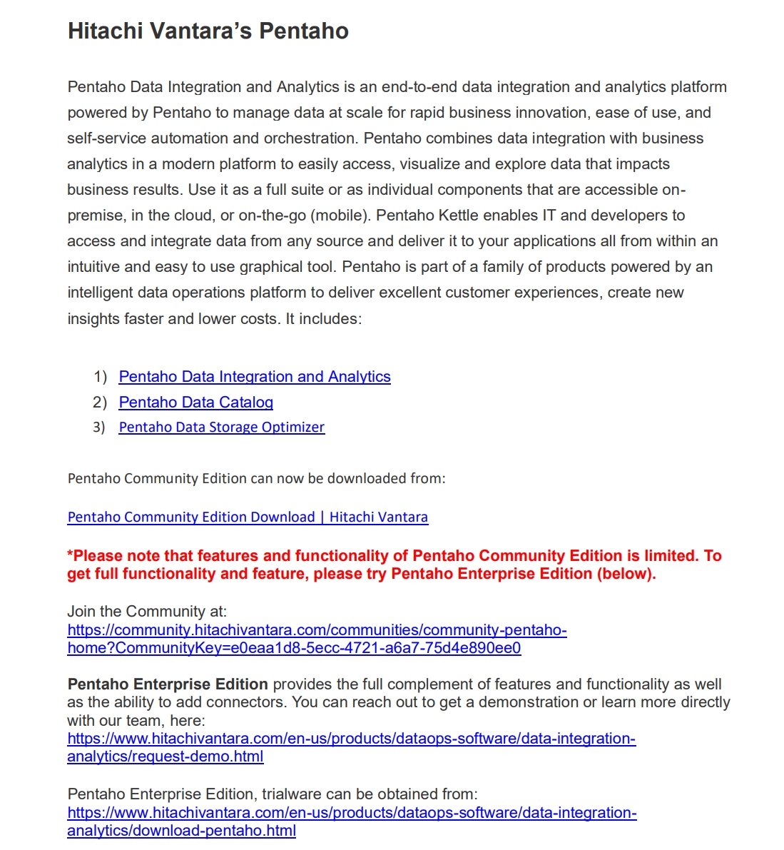 *请注意,Pentaho 社区版的特性和功能是有限的。获得完整的功能和特性,请尝试 Pentaho 企业版(如下)。