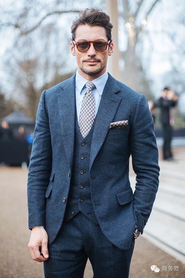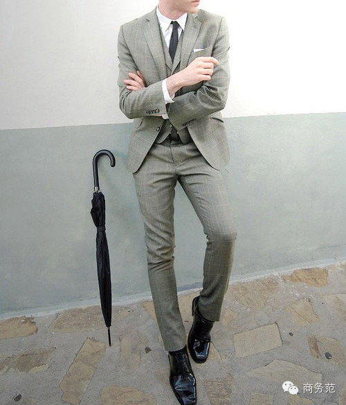 所谓的三件式西装穿法就是在一般的西装造型中,再多穿一件西装背心,藉由西装外套、背心和衬衫以及其他的配件,搭出多层次的效果,会让人觉得较沉稳充满气势,一个绅士须要具备的3件服装款式就是「三件式西装」,有点像作弊,可以分开穿也可以一起穿。也比较吻合当下的汹涌的复古范儿,最重要的是,不仅保暖还能拉长纵向线条,显高。