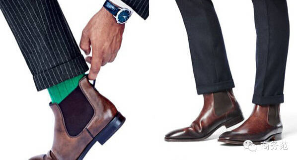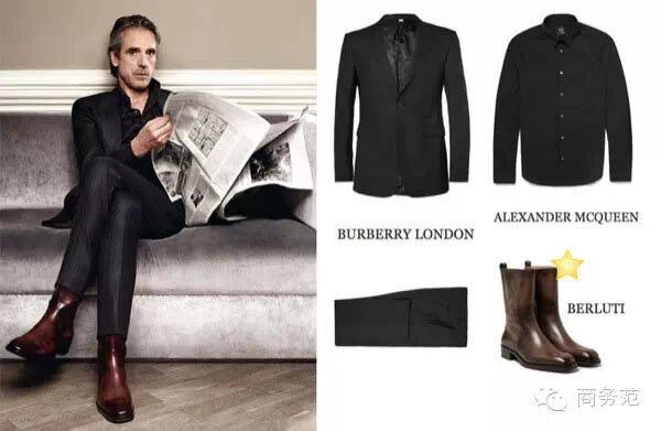 西装不一定配皮鞋,还可以蹬一双皮靴!高帮靴配上西裤,鞋帮和裤脚相连,线条流畅更显裤型笔挺,想要入手尝试的话纯黑西装加上一双切尔西靴是个不错的选择。