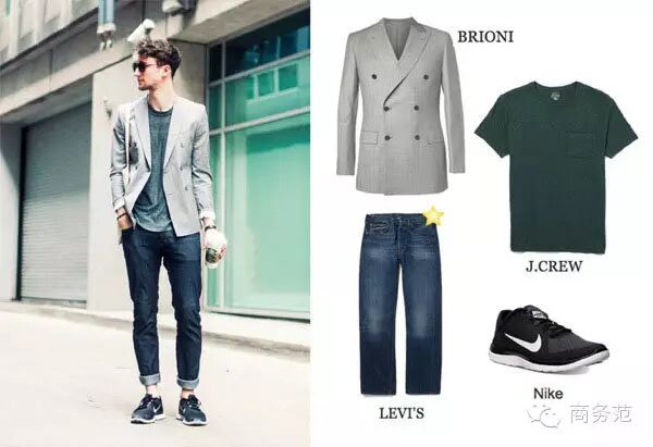 想要把西装穿得随性又有型,可以尝试一些混搭的技巧,最简单的则是西装+T恤/衬衫,混搭时有些小细节要注意,如果是西装搭配牛仔裤营造休閒风,重点就在于衬衫的颜色建议选择与牛仔裤相近。