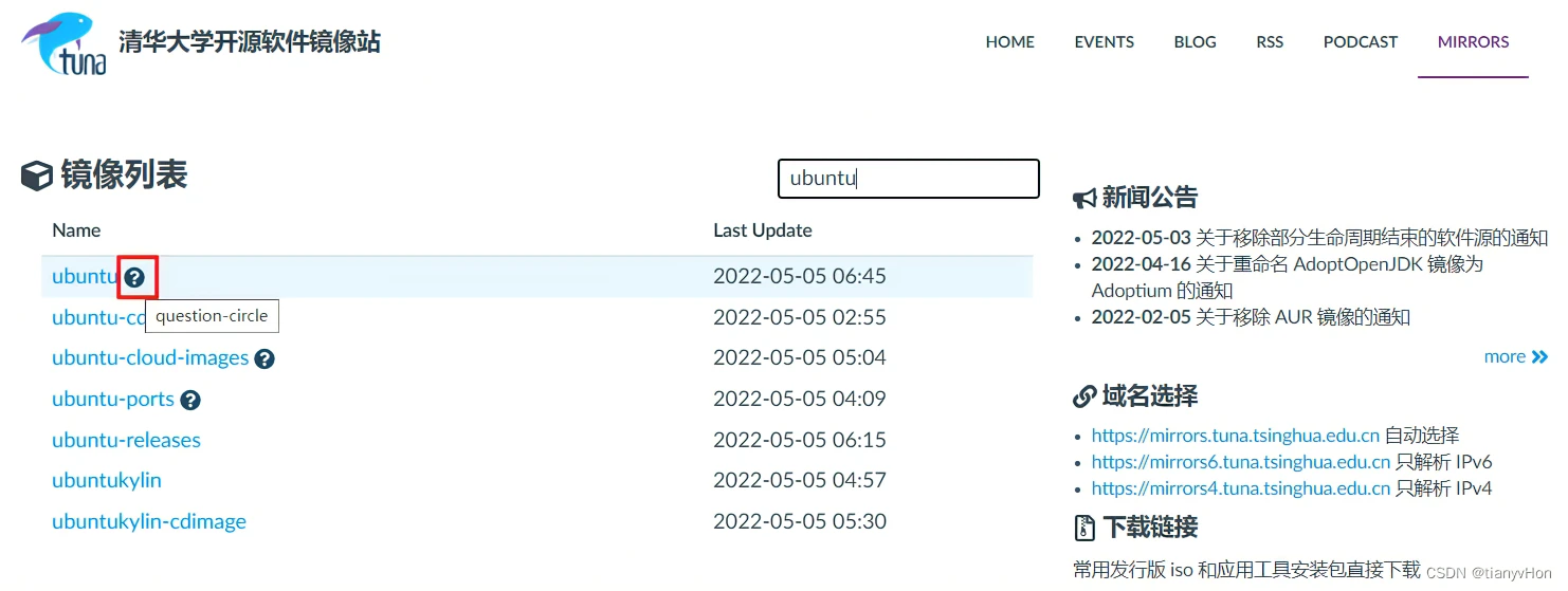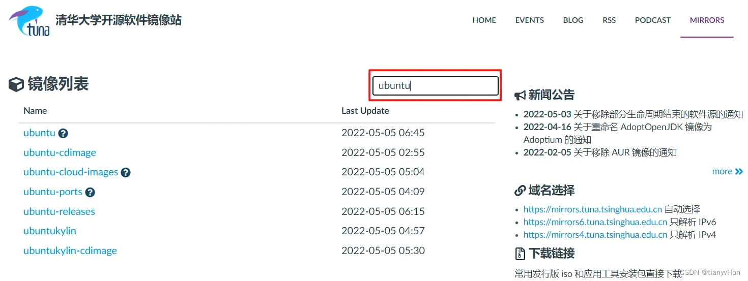打开清华镜像源官网,在搜索框中,输入 Ubuntu,窗口紧接着会筛选出关于 Ubuntu 的链接