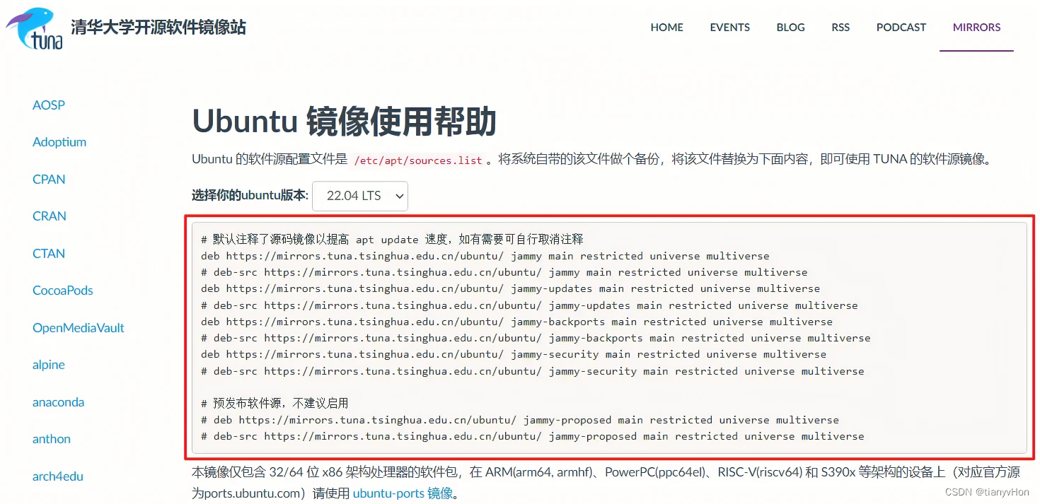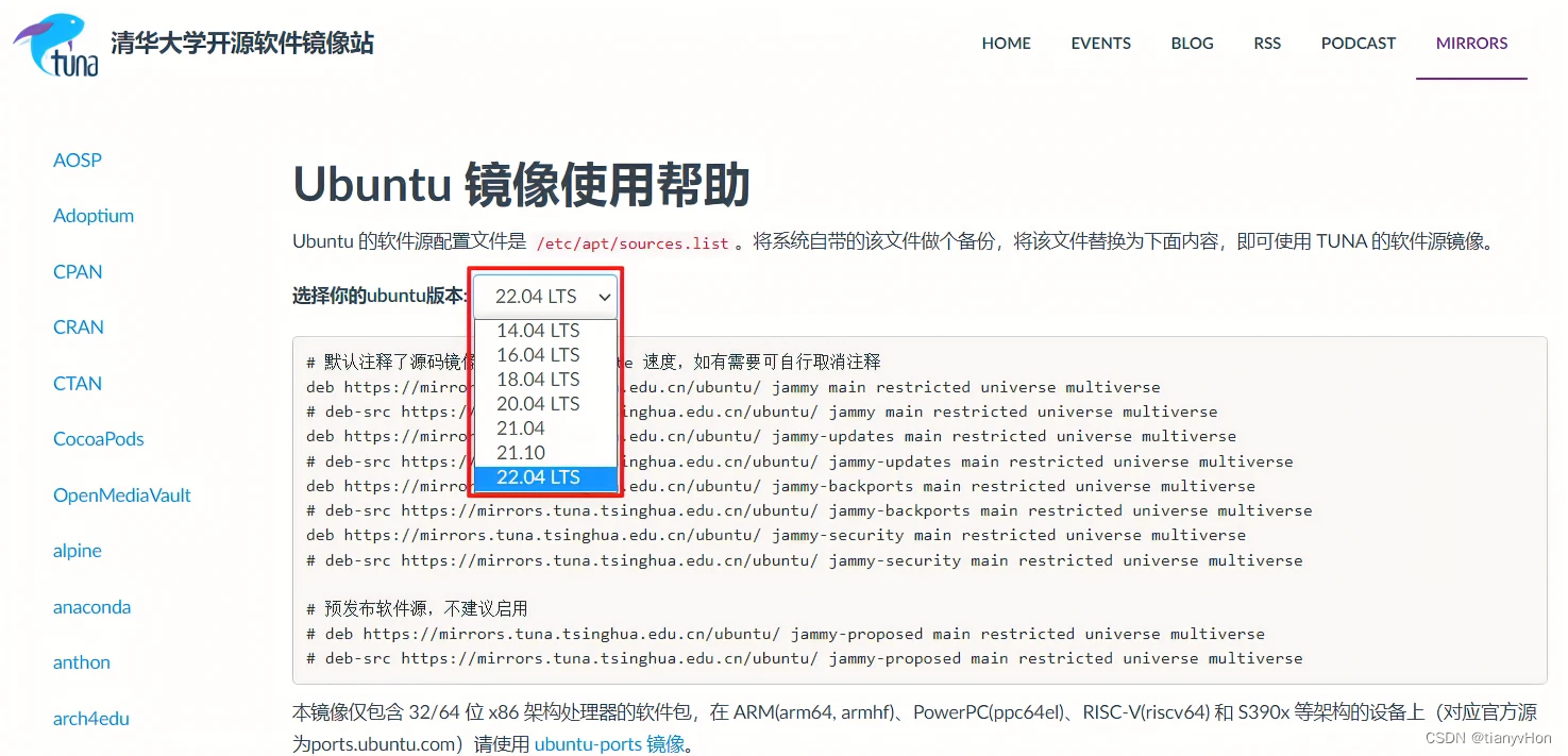 在选择你的 ubuntu 版本一栏,根据你的 Ubuntu 系统进行选择,同时下方会输出需要配置的镜像源链接列表
