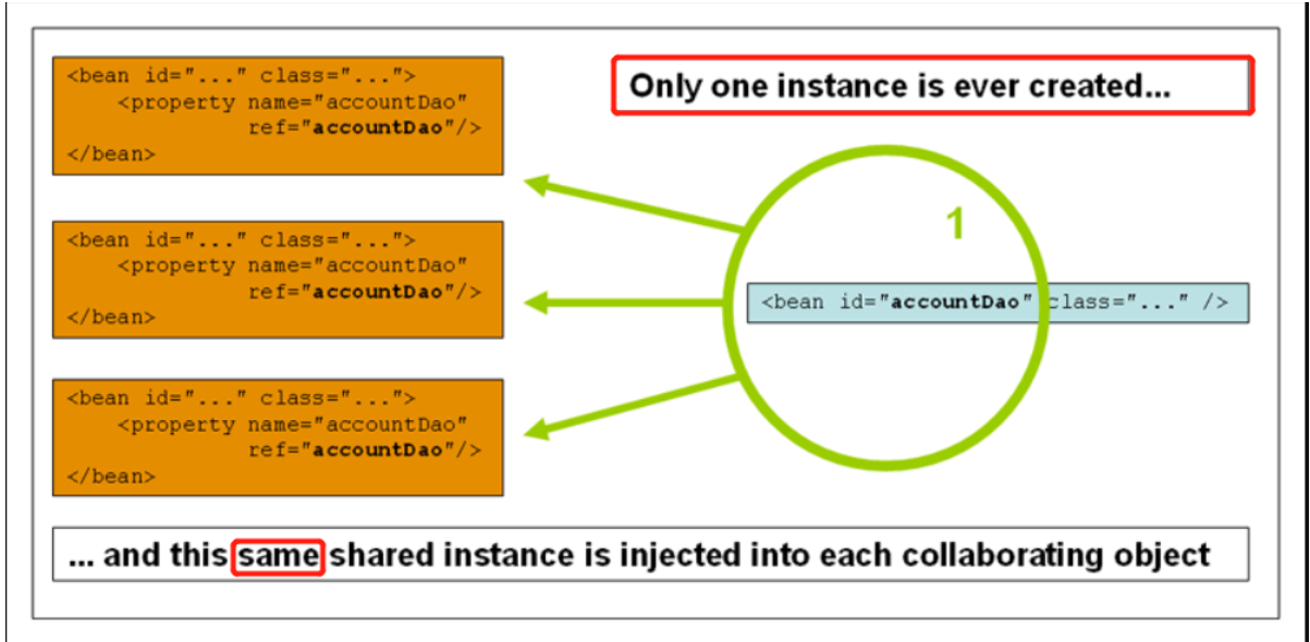 | singleton | (默认)为每个Spring IoC容器将单个bean定义的作用域限定为单个对象实例。 |