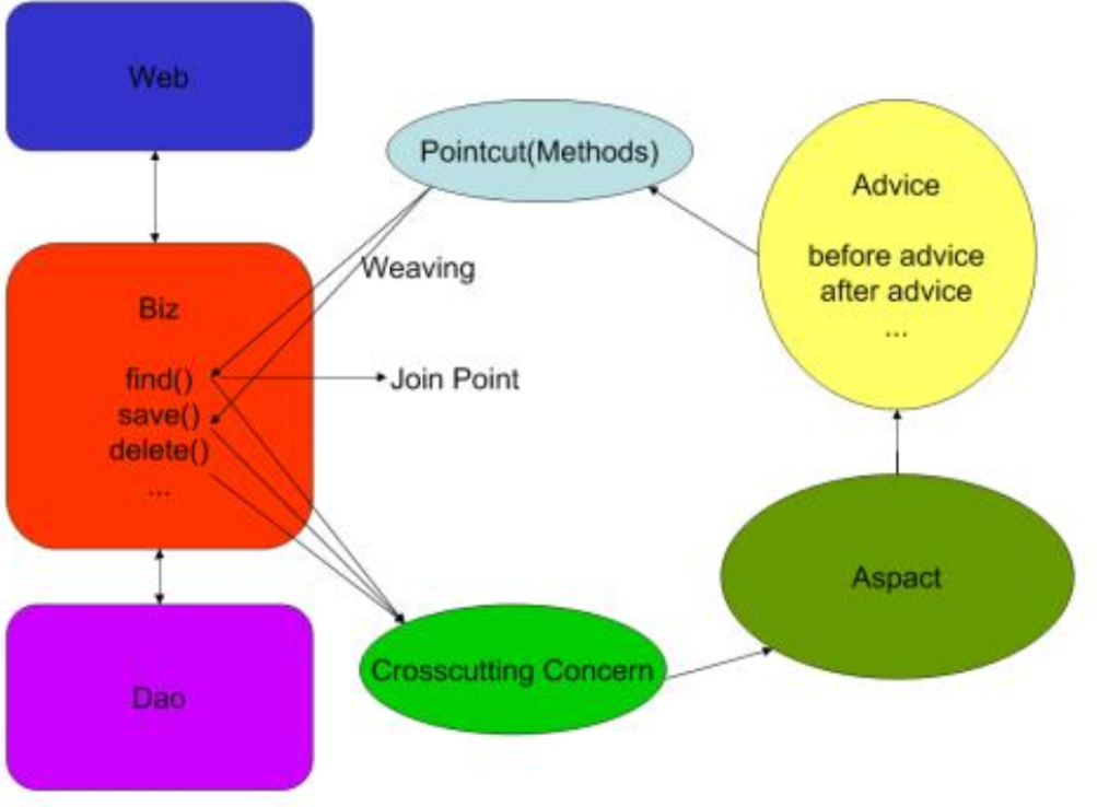 Advice(通知): AOP在特定的切入点上执行的增强处理,有before(前置),after(后置),afterReturning(最终),afterThrowing(异常),around(环绕) 其实afterReturning和afterThrowing二者只会有其中一个执行