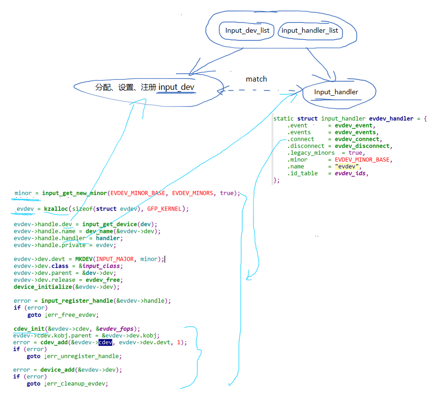 1. 申请得到一个次设备号,2.分配一个 evdev 结构体,3.填充该结构体中的 input_handle 结构体,4. input_handle 结构体中有两个成员:input_dev 和 input_handler 结构体;5.注册file_operations。