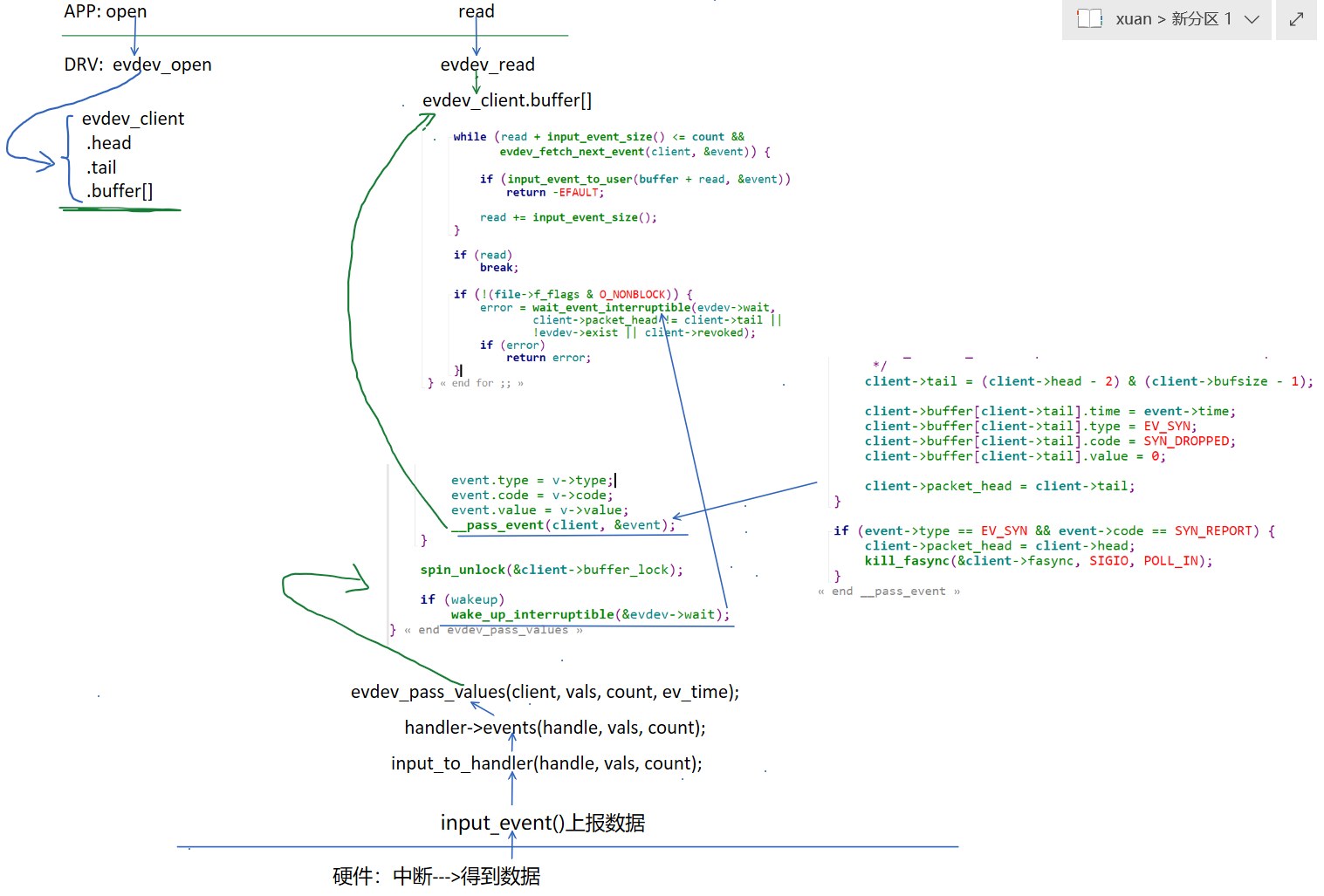 APP中的 open 函数通过调用驱动中的 evdev_open 函数,该函数实现:构造结构体 evdev_client(理解为应用程序的用户),结构体中包括环形缓冲区、头尾等,一个应用程序对应一个evdev_client ;应用程序读数据 read 的时候,调用驱动中的 evdev_read 函数,该函数实现:会分析是哪个应用程序也就是 evdev_client ,判断结构体中的环形缓冲区是否为空,为空就休眠,不为空就拷贝值返回用户空间 input_event_to_user,实质就是copy_to_user();