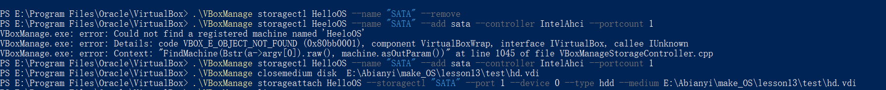 .\VBoxManage storageattach HelloOS --storagectl "SATA" --port 1 --device 0 --type hdd --medium E:\Abianyi\make_OS\lesson13\test\hd.vdi