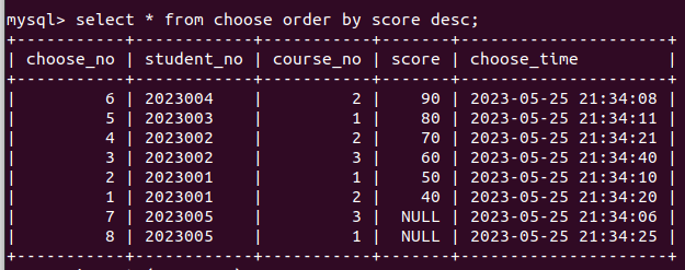 可以看到按总分降序排列;上述也可以写成,将 结果集的第四列的total_score 写成 4: