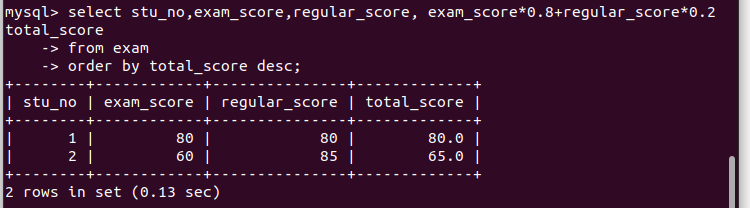 select stu_no,exam_score,regular_score, exam_score*0.8+regular_score*0.2 total_score from exam order by total_score desc;