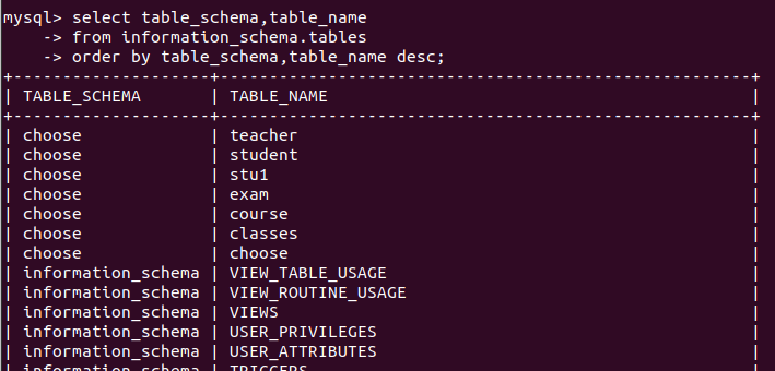 select table_schema,table_name from information_schema.tables order by table_schema,table_name desc;