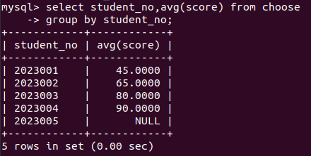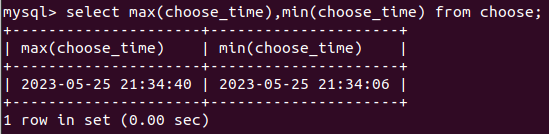select count(score),avg(score) from choose; select max(choose_time),min(choose_time) from choose;