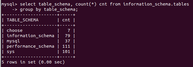 select table_schema, count(*) cnt from information_schema.tables group by table_schema;