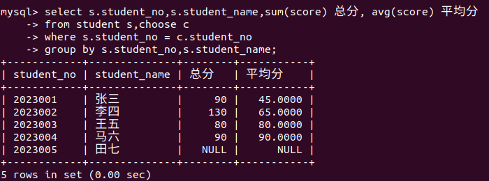 select s.student_no,s.student_name,sum(score) 总分, avg(score) 平均分 from student s,choose c where s.student_no = c.student_no group by s.student_no,s.student_name;