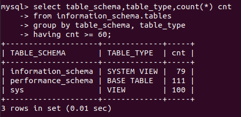 select table_schema,table_type,count(*) cnt from information_schema.tables group by table_schema, table_type having cnt >= 60;