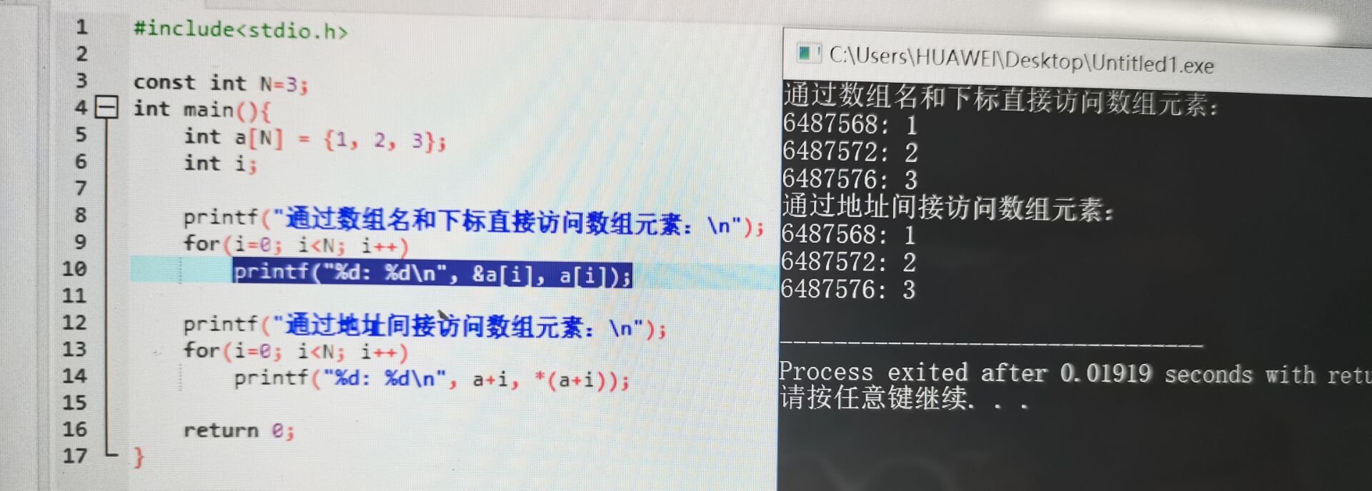 #include <stdio.h> const int N=3; int main() { int a[N] = {1, 2, 3}; int i; printf("通过数组名和下标直接访问数组元素:\n"); for(i=0; i<N; i++) printf("%d: %d\n", &a[i], a[i]); printf("通过地址间接访问数组元素:\n"); for(i=0; i<N; i++) printf("%d: %d\n", a+i, *(a+i)); return 0; }