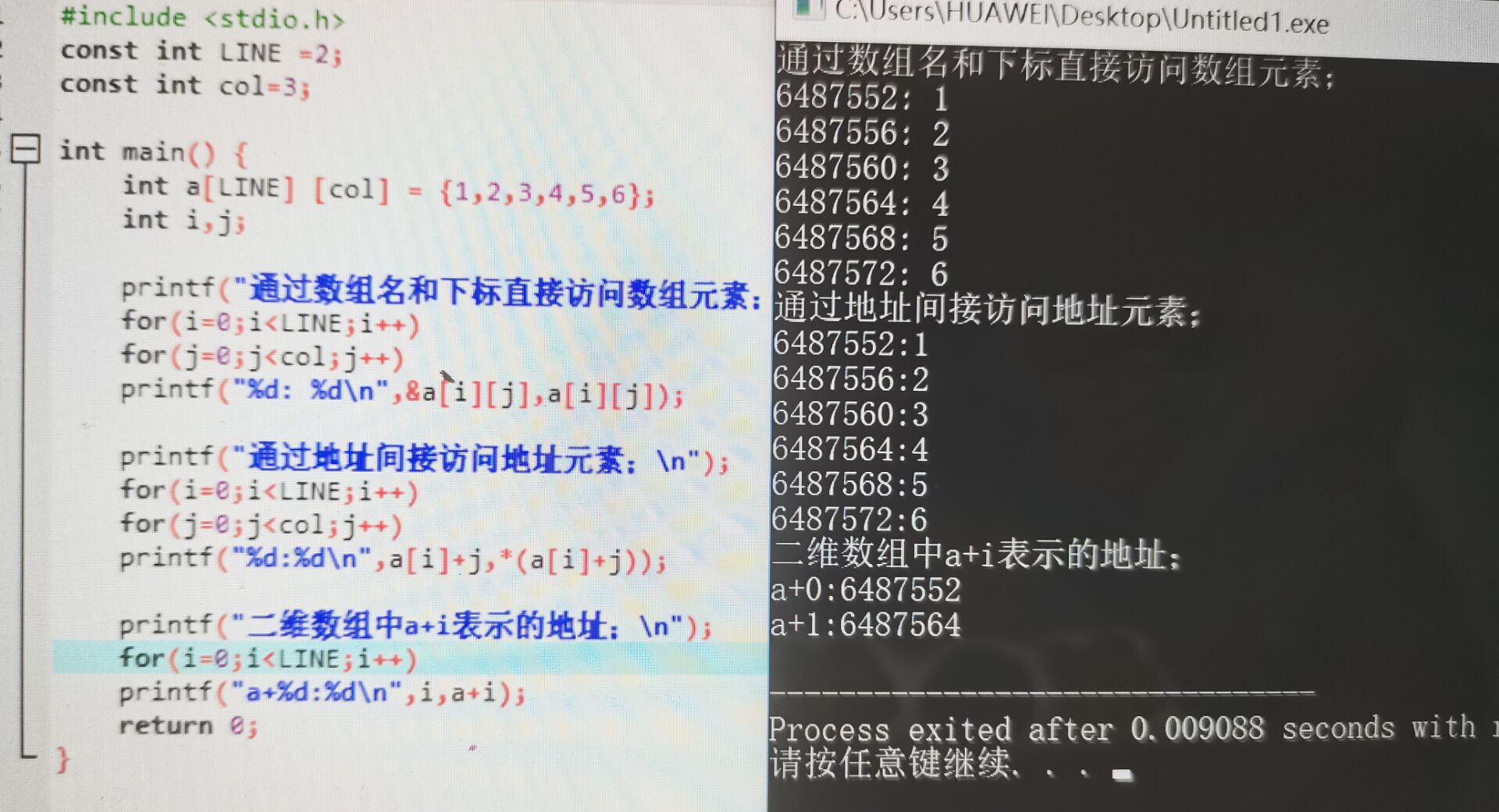 #include <stdio.h> const int LINE = 2; const int COL = 3; int main() { int a[LINE][COL] = {1,2,3,4,5,6}; int i,j; printf("通过数组名和下标直接访问数组元素:\n"); for(i=0; i<LINE; i++) for(j=0; j<COL; j++) printf("%d: %d\n", &a[i][j], a[i][j]); printf("通过地址间接访问数组元素:\n"); for(i=0; i<LINE; i++) for(j=0; j<COL; j++) printf("%d: %d\n", a[i]+j, *(a[i]+j)); printf("二维地址中a+i表示的地址:\n"); for(i=0; i<LINE; i++) printf("a + %d: %d\n", i, a+i); return 0; }