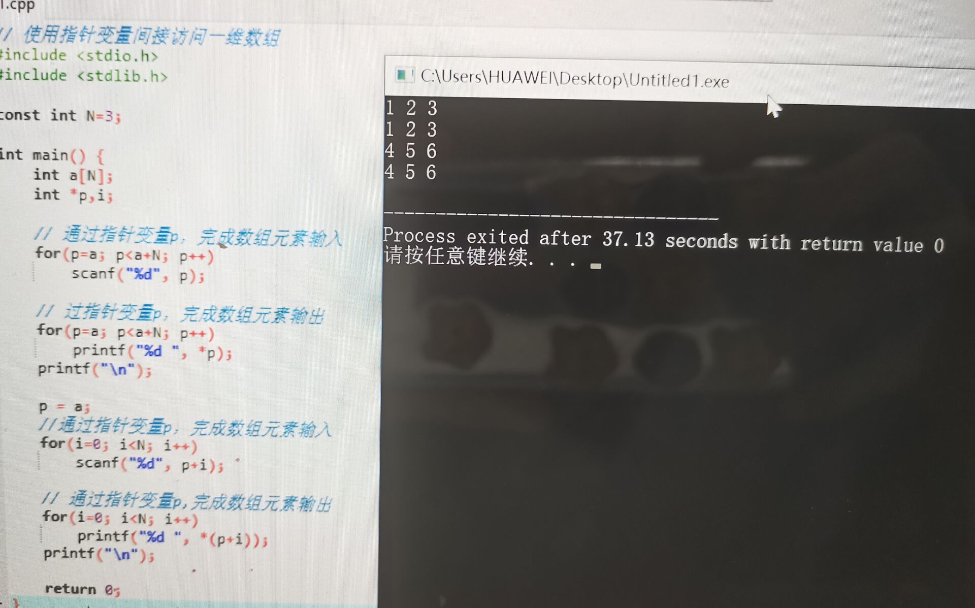 // 使用指针变量间接访问一维数组 #include <stdio.h> #include <stdlib.h> const int N=3; int main() { int a[N]; int *p,i; // 通过指针变量p,完成数组元素输入 for(p=a; p<a+N; p++) scanf("%d", p); // 过指针变量p,完成数组元素输出 for(p=a; p<a+N; p++) printf("%d ", *p); printf("\n"); p = a; //通过指针变量p,完成数组元素输入 for(i=0; i<N; i++) scanf("%d", p+i); // 通过指针变量p,完成数组元素输出 for(i=0; i<N; i++) printf("%d ", *(p+i)); printf("\n"); return 0; }![]()