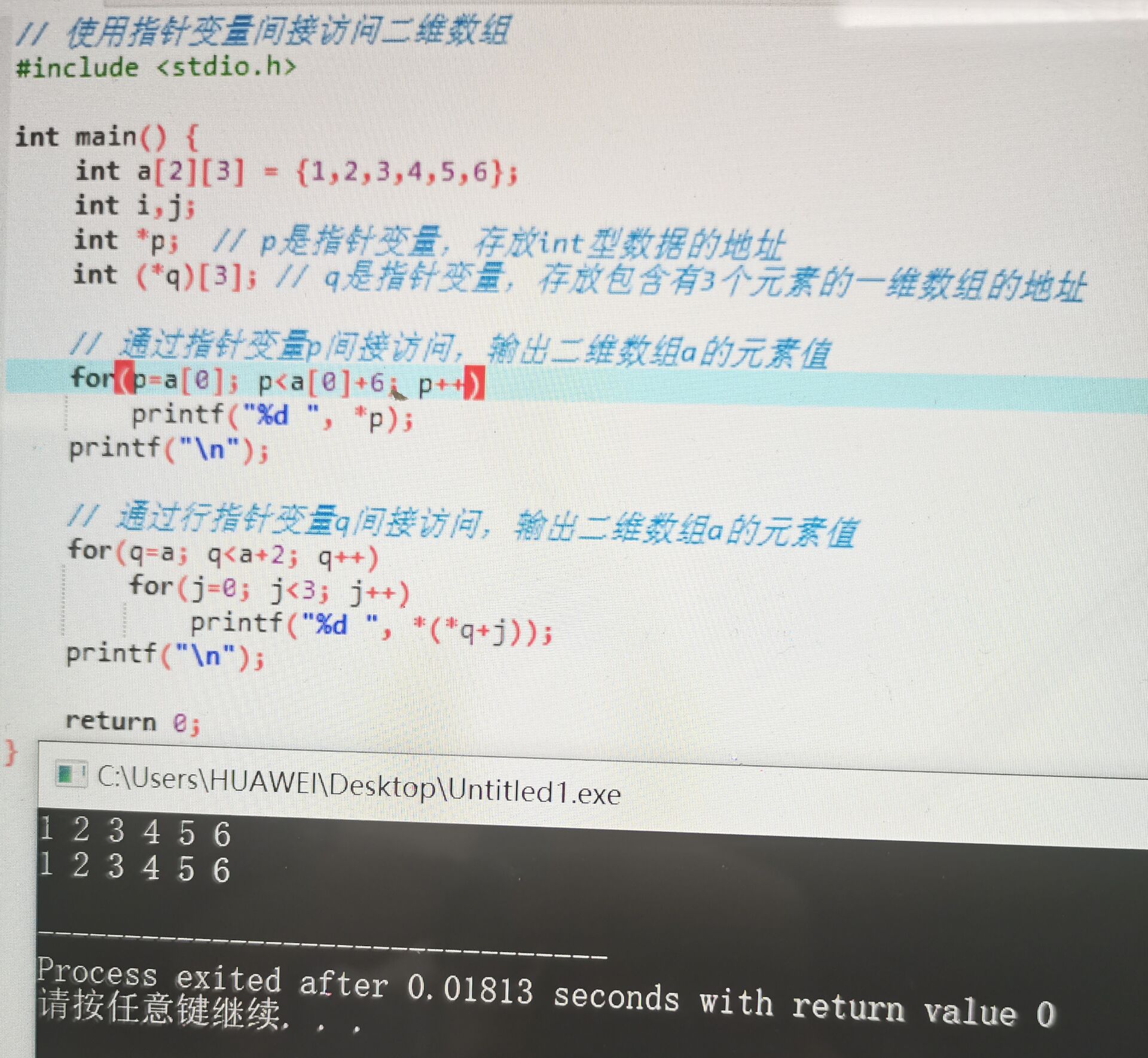 // 使用指针变量间接访问二维数组 #include <stdio.h> int main() { int a[2][3] = {1,2,3,4,5,6}; int i,j; int *p; // p是指针变量,存放int型数据的地址 int (*q)[3]; // q是指针变量,存放包含有3个元素的一维数组的地址 // 通过指针变量p间接访问,输出二维数组a的元素值 for(p=a[0]; p<a[0]+6; p++) printf("%d ", *p); printf("\n"); // 通过行指针变量q间接访问,输出二维数组a的元素值 for(q=a; q<a+2; q++) for(j=0; j<3; j++) printf("%d ", *(*q+j)); printf("\n"); return 0; }