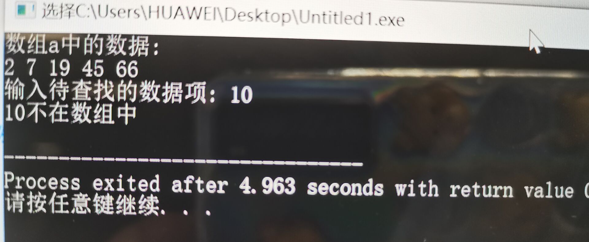 // 练习:使用二分查找,在一组有序元素中查找数据项 // 形参是数组,实参是数组名 #include <stdio.h> const int N=5; int binarySearch(int x[], int n, int item); // 函数声明 int main() { int a[N]={2,7,19,45,66}; int i,index, key; printf("数组a中的数据:\n"); for(i=0;i<N;i++) printf("%d ",a[i]); printf("\n"); printf("输入待查找的数据项: "); scanf("%d", &key); // 调用函数binarySearch()在数组a中查找指定数据项key,并返回查找结果给index index=binarySearch(a,N,key); if(index>=0) printf("%d在数组中,下标为%d\n", key, index); else printf("%d不在数组中\n", key); return 0; } //函数功能描述: //使用二分查找算法在数组x中查找特定值item,数组x大小为n // 如果找到,返回其下标 // 如果没找到,返回-1 int binarySearch(int x[], int n, int item) { int low, high, mid; low = 0; high = n-1; while(low <= high) { mid = (low+high)/2; if (x[mid]==item) return mid; else if(x[mid]>item) high = mid - 1; else low = mid + 1; } return -1; }