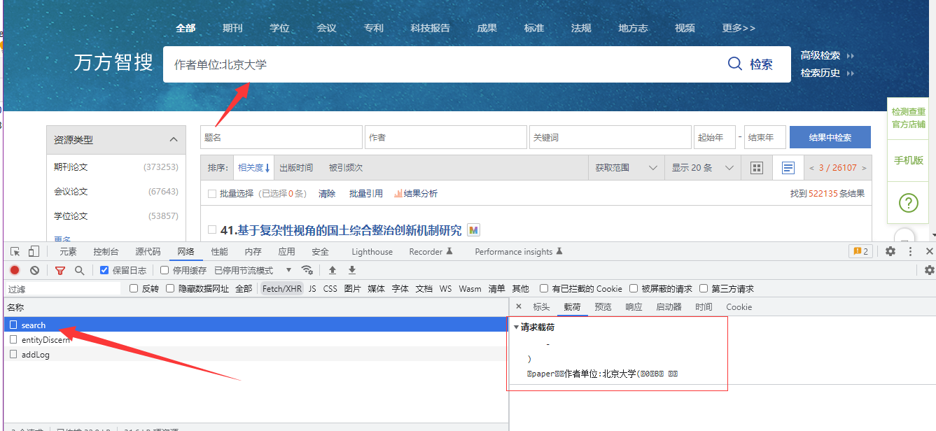 Console.Write($"{stxt}====开始下载 获取总条数:"); int pageSize = 50; int rowCount = GetRowCount(stype,stxt, year, year); Console.WriteLine($"{rowCount}"); Console.WriteLine(); --后面的我给删了,不能写太全了 } /// <summary> /// 返回总条数 /// </summary> /// <param name="stype">检索类型:issn,org,term 检索式检索</param> /// <param name="stxt">北京大学/1111-1111</param> /// <param name="year">空或者2018</param> /// <returns></returns> static int GetRowCount(string stype, string stxt, string syear, string eyear) { SearchInfo info = GetInfo(stype, stxt, syear, eyear, 1); int count = info.A3; return count; } /// <summary> /// 编辑检索式去检索得到返回数据 /// </summary> /// <param name="stype">检索类型:issn,org,term 检索式检索</param> /// <param name="stxt">北京大学/1111-1111</param> /// <param name="syear"></param> /// <param name="eyear"></param> /// <param name="page"></param> /// <returns></returns> static SearchInfo GetInfo(string stype,string seartxt, string syear, string eyear, int page) { //1.参数 SearchRequest sr = new SearchRequest(); CommonRequest common = new CommonRequest(); common.SearchType = "paper"; string stypr2 = ""; stypr2 = $"作者单位:(\"{seartxt}\")"; common.SearchWord = term; common.CurrentPage = page; common.PageSize = 50; common.SearchFilter.Add(0); CommonRequest4 a4 = new CommonRequest4(); a4.A1 = "Type"; a4.A2 = "(Periodical OR Thesis OR Conference)";//(Periodical OR Thesis OR Conference) common.A4 = a4; CommonRequest3 a3 = new CommonRequest3(); a3.A1 = "出版时间"; a3.A2 = 1; common.A3 = a3; sr.InterfaceType = 1; sr.Commonrequest = common; byte[] byteData = sr.ToByteArray(); //2.参数前加5个0 int d = byteData.Length; byte[] b1 = new byte[] { 0, 0, 0, 0, Convert.ToByte(d) }; byte[] b2 = byteData; byte[] b3 = new byte[b1.Length + b2.Length]; b1.CopyTo(b3, 0); b2.CopyTo(b3, b1.Length); string byteDataStr = Encoding.UTF8.GetString(b3); string url = "https://s..com.cn/SearchService.SearchService/search"; Stream stream = GetHtmlByPostUrl3(url, b3); MemoryStream ms2 = StreamToMemoryStream(stream); //掐头去尾 前5和后20 byte[] btt1 = StreamToBytes(ms2); byte[] btt2 = btt1.Skip(5).Take(btt1.Length - 25).ToArray(); //byte[] btt3 = btt2.Take(btt1.Length - 25).ToArray(); SearchInfo dat2 = SearchInfo.Parser.ParseFrom(btt2);//反序列化 return dat2; } #endregion #region 工具 static Stream GetHtmlByPostUrl3(string url, byte[] byteData, int err = 1) { try { //实例化编码方式 //UTF8Encoding encoding = new UTF8Encoding(); Encoding encoding = Encoding.GetEncoding("utf-8"); //根据请求链接参数需求对参数字符串转为二进制字符组 //byte[] byteData = encoding.GetBytes(postData); //创建请求对象 HttpWebRequest request = (HttpWebRequest)WebRequest.Create(url); request.Host = "s.wanfangdata.com.cn"; //请求用户代理 request.UserAgent = " Mozilla/5.0 (Windows NT 10.0; Win64; x64) AppleWebKit/537.36 (KHTML, like Gecko) Chrome/87.0.4280.88 Safari/537.36"; //请求头协议方式 request.Accept = "*/*"; //请求头语言 request.Headers.Add("Accept-Language", "zh-CN,zh;q=0.9"); //请求类型 request.ContentType = "application/grpc-web+proto"; //设置请求数据长度 request.ContentLength = byteData.Length; request.Method = "POST"; request.Referer = "https://s.wanfangdata.com.cn/advanced-search/paper"; request.CookieContainer = new CookieContainer(); //设置请求等待时间 request.Timeout = 100000; request.ReadWriteTimeout = 100000; //将请求到数据放入到流中 Stream reqStream = request.GetRequestStream(); //输出流 reqStream.Write(byteData, 0, byteData.Length); //返回对象 HttpWebResponse objResponse = (HttpWebResponse)request.GetResponse(); Stream streamResponse = objResponse.GetResponseStream(); //关闭流 reqStream.Close(); return streamResponse; } catch (Exception e) { } return null; } static MemoryStream StreamToMemoryStream(Stream stream) { MemoryStream memoryStream = new MemoryStream(); //将基础流写入内存流 const int bufferLength = 1024; byte[] buffer = new byte[bufferLength]; int actual = stream.Read(buffer, 0, bufferLength); while (actual > 0) { // 读、写过程中,流的位置会自动走。 memoryStream.Write(buffer, 0, actual); actual = stream.Read(buffer, 0, bufferLength); } memoryStream.Position = 0; return memoryStream; } static byte[] StreamToBytes(Stream stream) { byte[] bytes = new byte[stream.Length]; stream.Read(bytes, 0, bytes.Length); stream.Seek(0, SeekOrigin.Begin); return bytes; } #endregion }