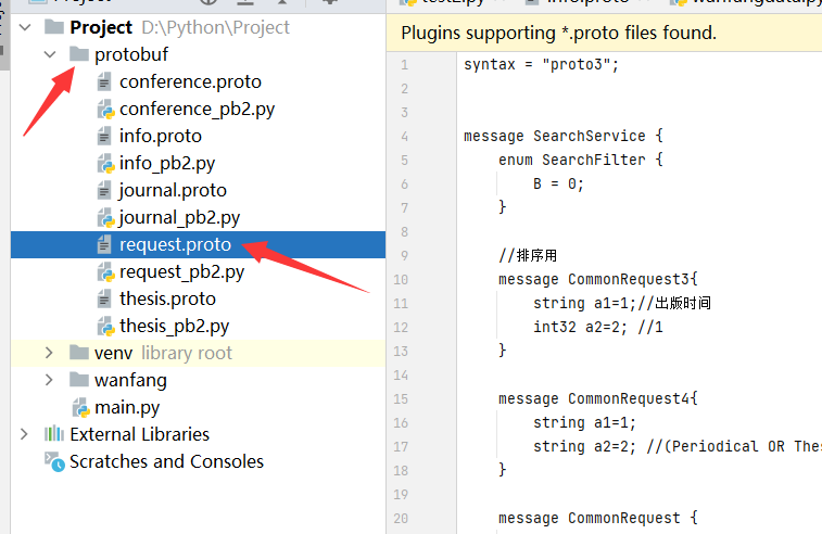 syntax = "proto3"; message SearchService { enum SearchFilter { B = 0; } //排序用 message CommonRequest3{ string a1=1;//出版时间 int32 a2=2; //1 } message CommonRequest4{ string a1=1; string a2=2; //(Periodical OR Thesis OR Conference) } message CommonRequest { string searchType = 1; string searchWord = 2; CommonRequest3 a3=3; CommonRequest4 a4=4; int32 currentPage = 5; int32 pageSize = 6; repeated SearchFilter searchFilter = 8; } enum InterfaceType { // 定义了什么不知道,但是enum必须有一个值就是0 DEFAUTL = 0; } message SearchRequest { CommonRequest commonrequest = 1; // 任意变量名 int32 interfaceType = 2; // 任意变量名 } }
