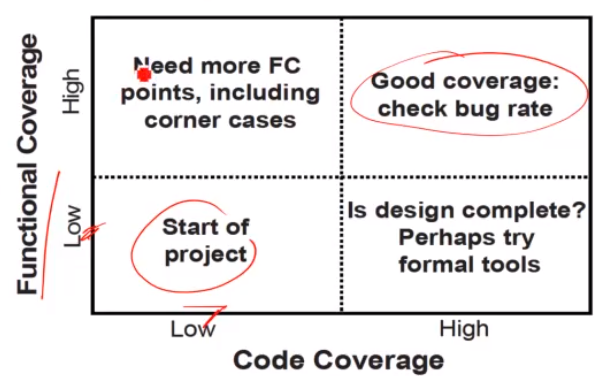 - 如果代码覆盖率高但功能覆盖率低,这说明即使测试平台很好的执行了设计的所有代码,但测试还是没有把设计定位到所有感兴趣的状态上